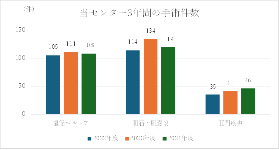 このような患者さんの「早く手術をしたい」というニーズに答えるため、このたび当センターでは鼠径ヘルニア・胆石・肛門疾患に特化した「ヘルニア・胆石・肛門センター」を開設しました。